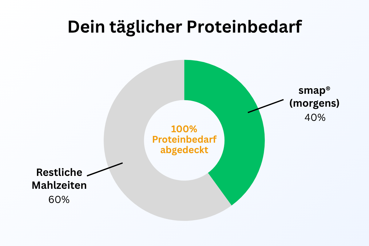 Wenn du deinen Tag mit smap® beginnst, hast du bereits vor dem Mittagessen 40% deines täglichen Proteinbedarfs optimal abgedeckt. Es ist der perfekte Boost für jeden, der seine Ernährung optimieren möchte, ohne auf Bequemlichkeit oder Wirksamkeit zu verzichten.